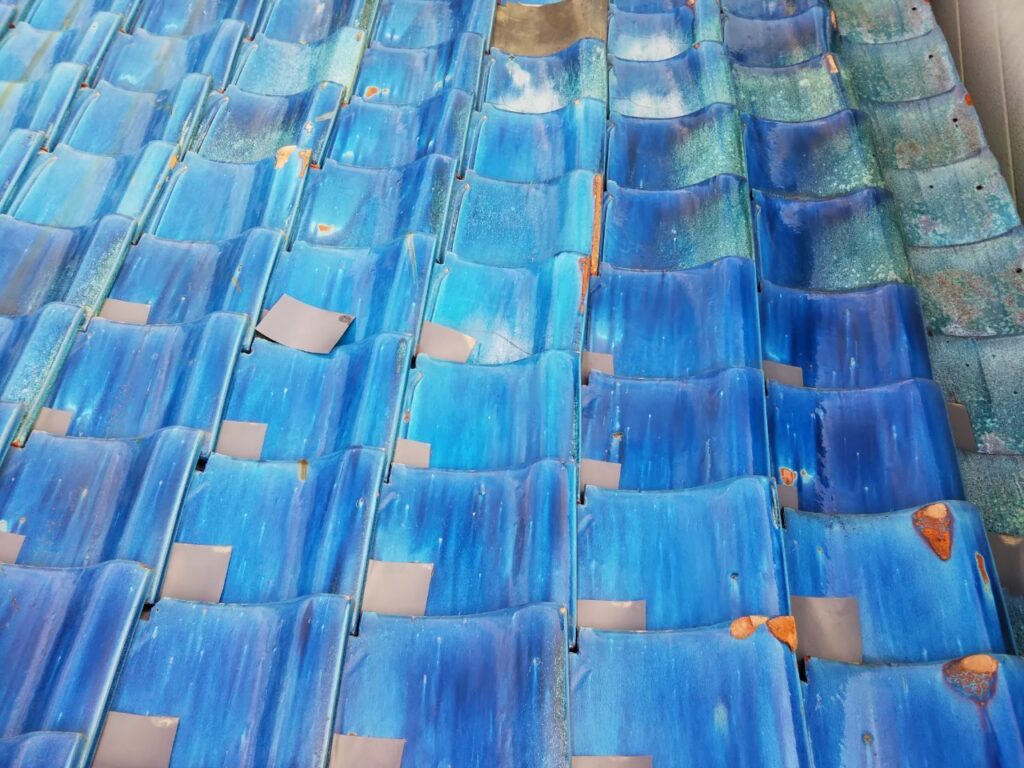 葺き替えされた、お客様の屋根はブルー色の瓦(釉薬瓦)のお宅です。