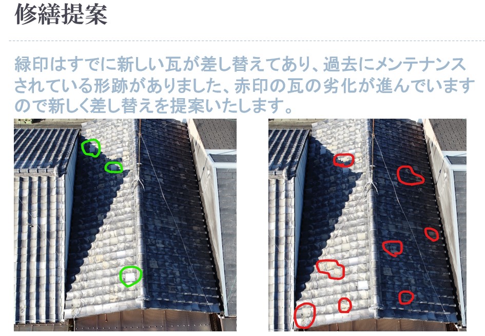 そりゃ商売だから、「屋根の調査」「ドローン調査」でいかがですか?