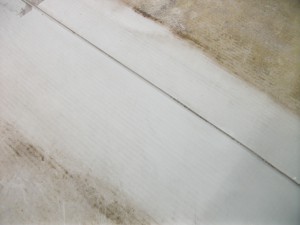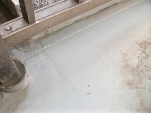 「京都市右京区」にて「雨漏り修理」。「屋根」は陸屋根。5年前に防水工事したばかりだそうです。雨が降ると洗面器一杯分の「雨漏り」!!なんで??