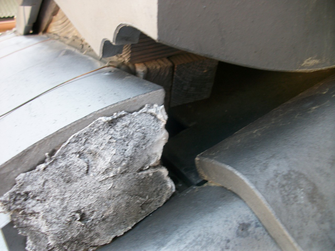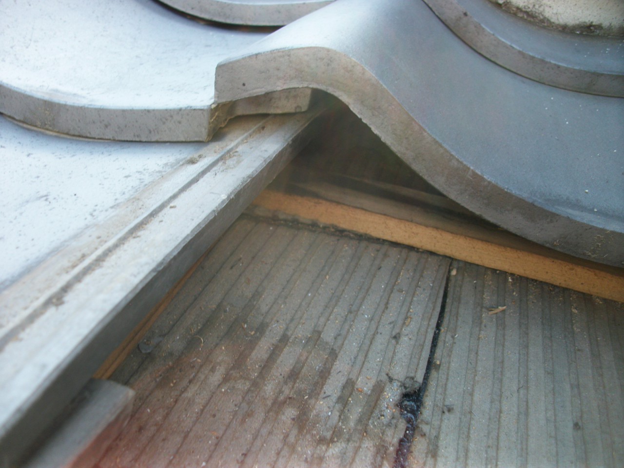 瓦の裏側をのぞいてみると、破風板をかわすため、瓦を切り欠いています。